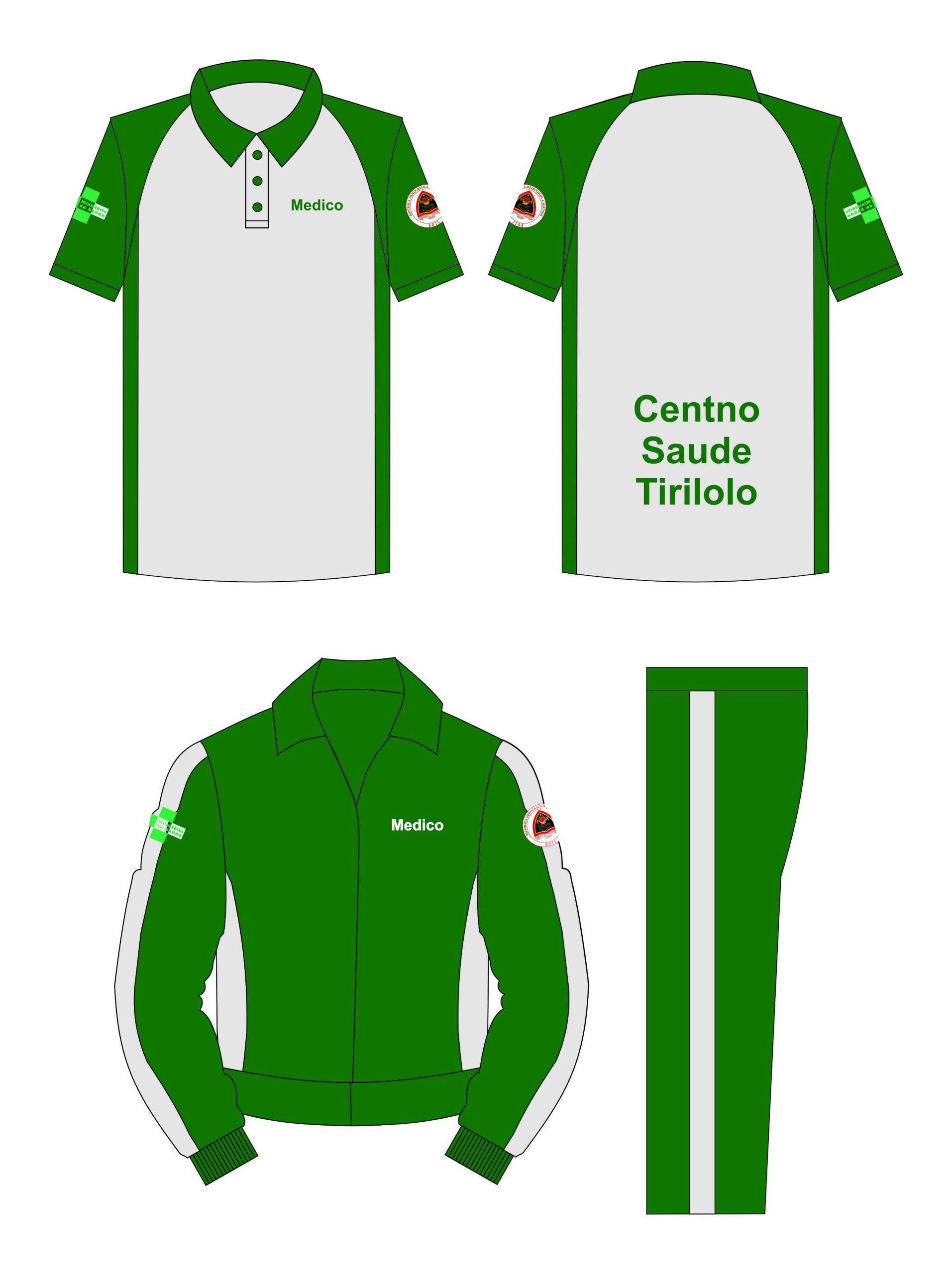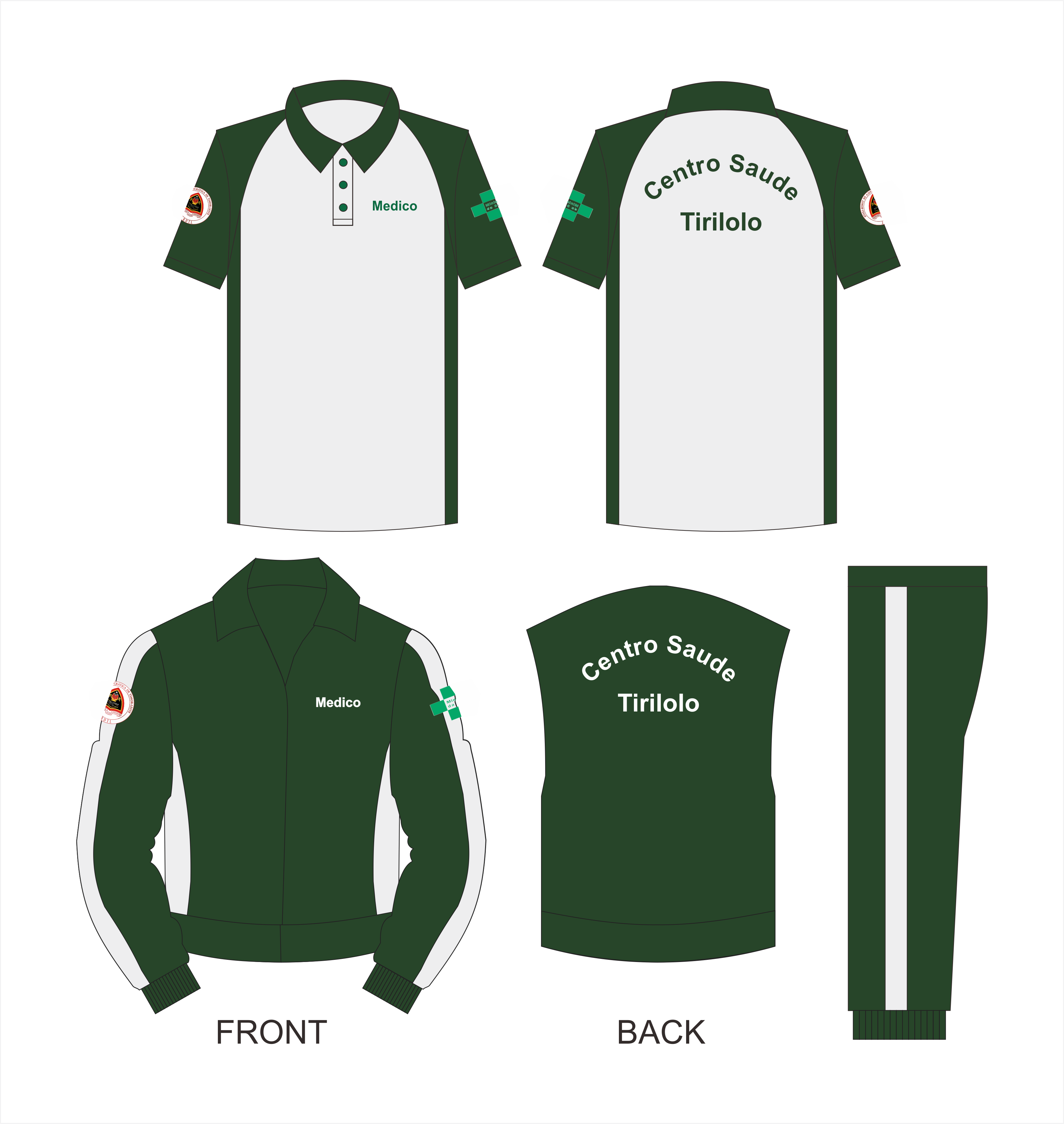 Pada bagian kaos training, digunakan model berkerah dengan dominasi warna putih di bagian depan dan belakang, serta sentuhan hijau tua di bagian lengan dan sisi badan. Terdapat tulisan “Medico” di bagian dada kiri, serta tulisan “Centro Saude Tirilolo” di bagian belakang, menegaskan identitas pemesan. Lengan kiri dan kanan dihiasi dengan emblem khas, menambah kesan eksklusif.